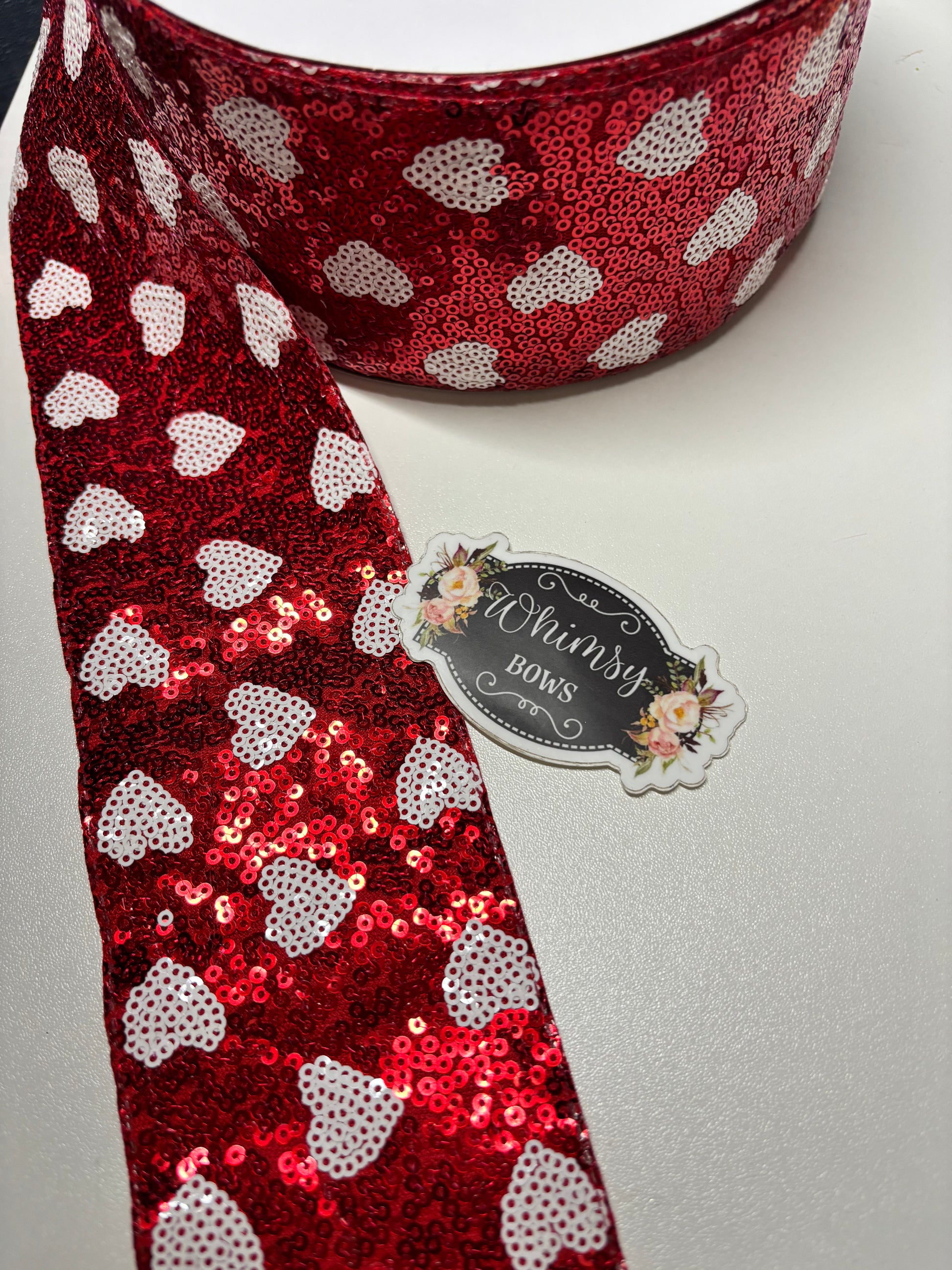 3 INCH SEQUIN WHITE HEARTS ON RED